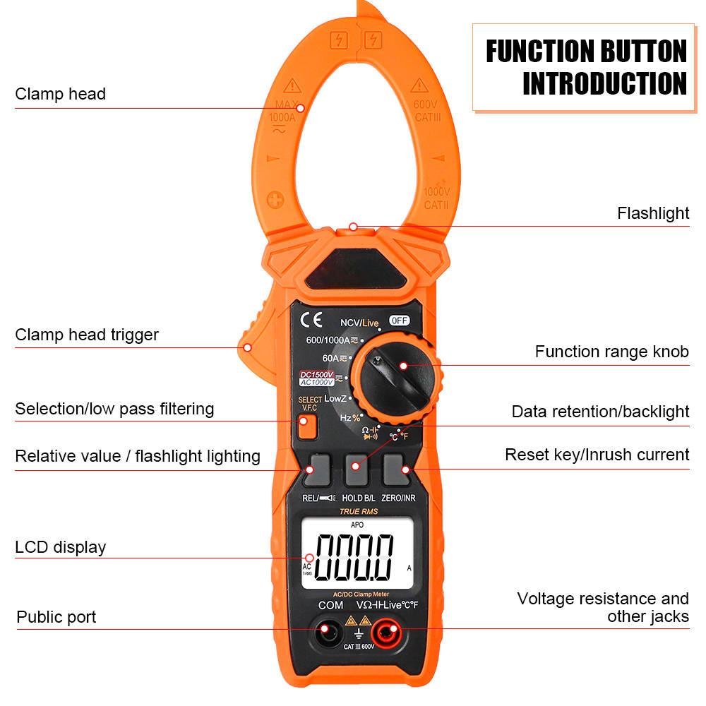 The DC 1500V AC DC 1000A True RMS Digital Clamp Multimeter is a high-performance measuring tool with 5999 counts, designed for accurate and versatile electrical testing. It features True RMS technology, ensuring precise readings for both sinusoidal and non-sinusoidal signals, making it reliable for professional and industrial applications.