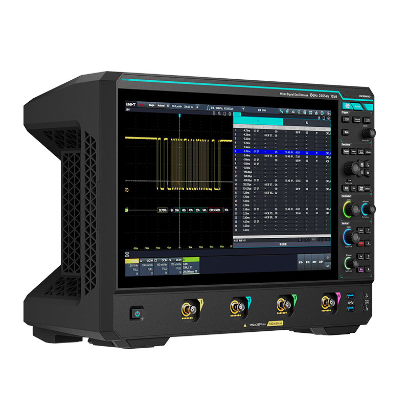 The High-resolution oscilloscope 8GHz/5GHz 1007004 provides two bandwidth options (8GHz and 5GHz), with a standard 20GSa/s sampling rate and 12-bit vertical resolution across all models. It uses Uni-T’s self-developed oscilloscope analog front-end chipset, which substantially optimizes performance and reduces background noise—delivering strong advantages in high-speed and high-dynamic-range signal testing.