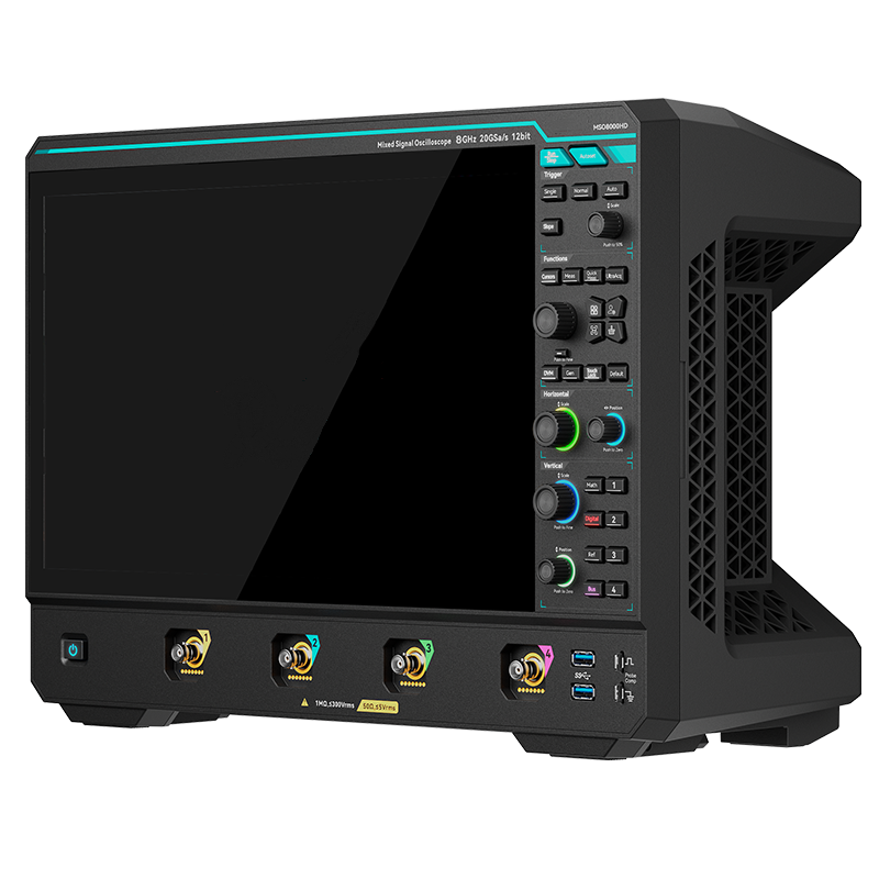You surely aim for outstanding R&D results, which requires exploring more data from new perspectives, and the MSO8000HD supports this goal. It acts like a clear window, letting you gain clear insights into various issues during R&د. This oscilloscope supports up to 4 channels, equipped with an R12™ 12-bit ADC that boosts to 16-bit resolution via ERES. It has a maximum 2.5GSa/s sampling rate, 100Mpts/CH memory depth and 1,000,000wfms/s waveform capture rate, ensuring high-quality waveform analysis.