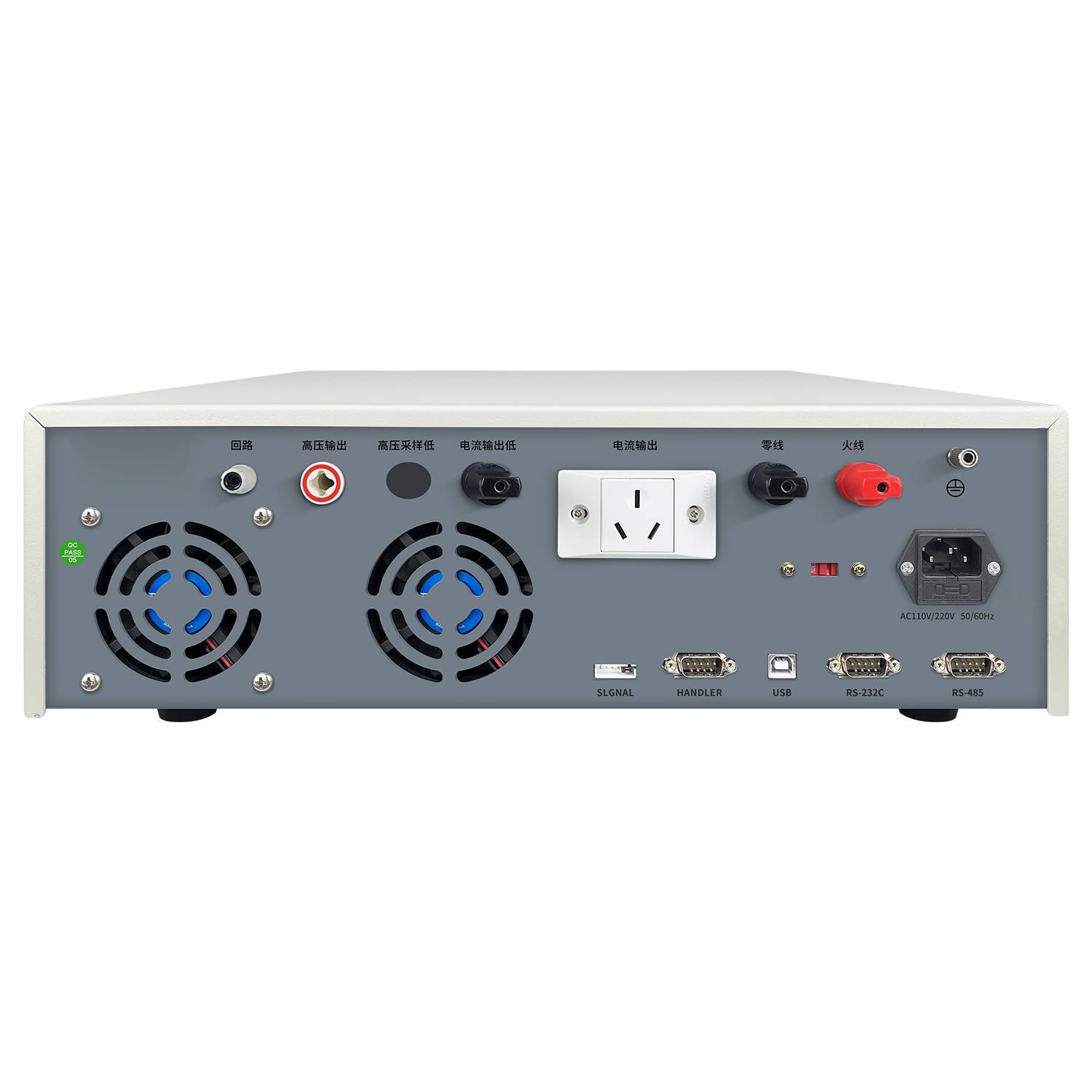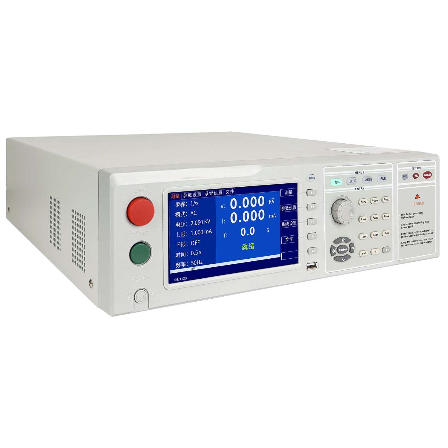 This tester features adjustable voltage rise and fall times to meet diverse test object requirements, and supports dual-frequency comprehensive testing (50Hz, 60Hz). It offers a bilingual (Chinese/English) operation interface, catering to different user needs. With a memory capacity to store 140 test files (each with up to 20 test steps), it comes standard with PLC, RS232C, RS485, and USB interfaces. A 7-inch TFT (800*480) display clearly presents setup and test parameters.