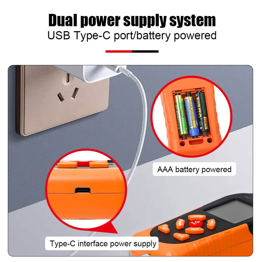 Equipped with functions like max/min value recording, alarm value setting, data hold, and backlight display, it operates on 3×1.5V 7# batteries with a sampling rate of 1 time/second. The device uses an ABS shell, measures 1675930mm, and weighs approximately 150g (including batteries). It works in 0°C~40°C (<90%RH non-condensing) and stores in -20°C~60°C (<75%RH).