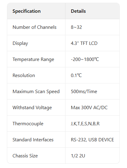 The Multichannel Temperature Tester 1024020 features a 4.3-inch LCD display and supports a test range of -200°C to 1800°C. It accepts J, K, T, E, S, N, B, and R thermocouple inputs. It simultaneously collects multiple temperature data channels, displaying intuitive numeric readouts, bar graphs, and curves. Users can access various parameters in multiple ways and record data to a USB memory device. The instrument also features over- and under-limit alarms and communication transmission. Its comprehensive functionality, superior performance, and simple operation meet the measurement needs of a wide range of production, laboratory, and R&D facilities. The instrument supports real-time USB storage for sampled data, allowing users to independently calibrate each channel. RS232 and USB communication interfaces are standard, enabling data acquisition, analysis, and printing via the included computer software.